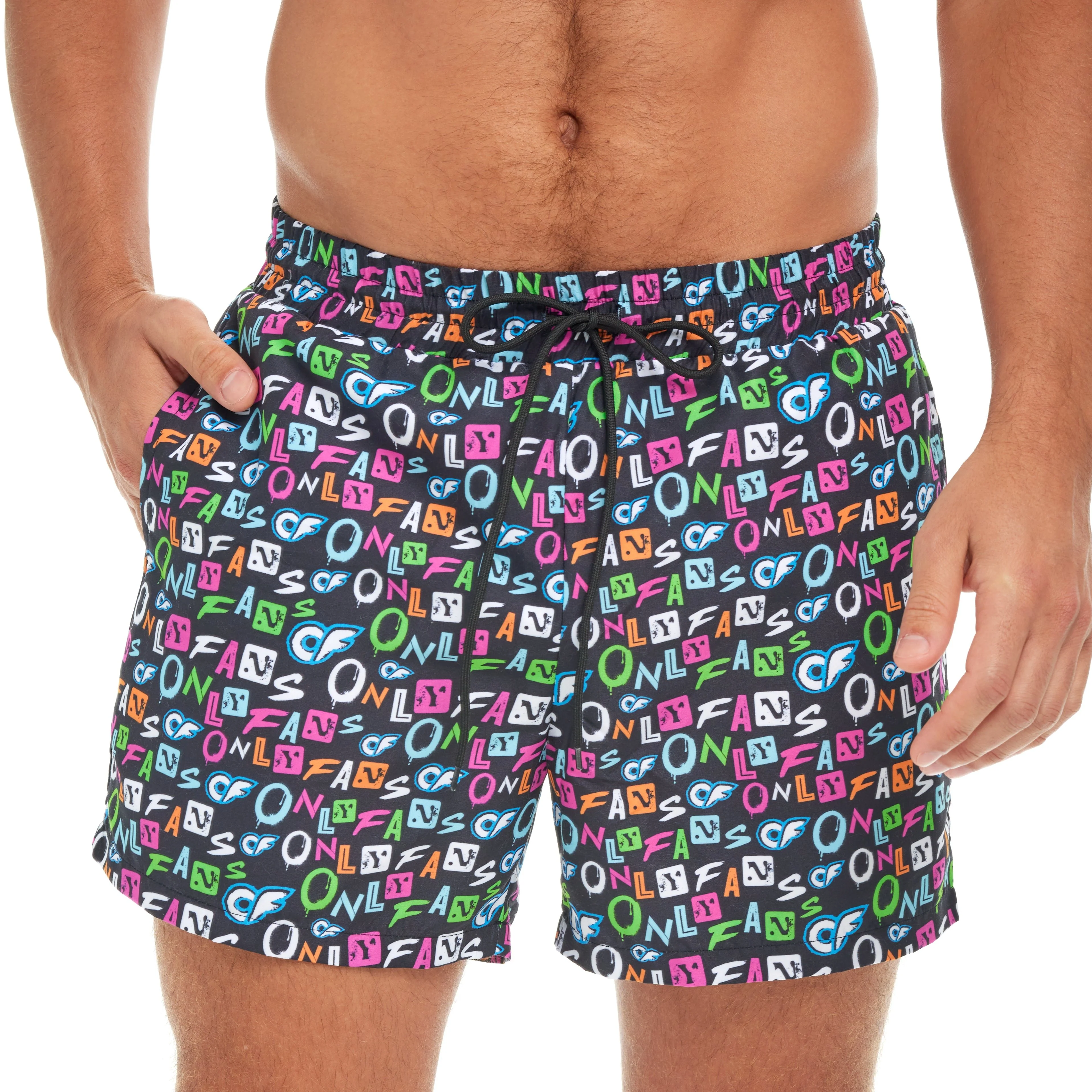 Hit the beach in the OnlyFans Swim Trunks! These shorts feature side pockets, a drawstring waist, and come in an exclusive pattern.